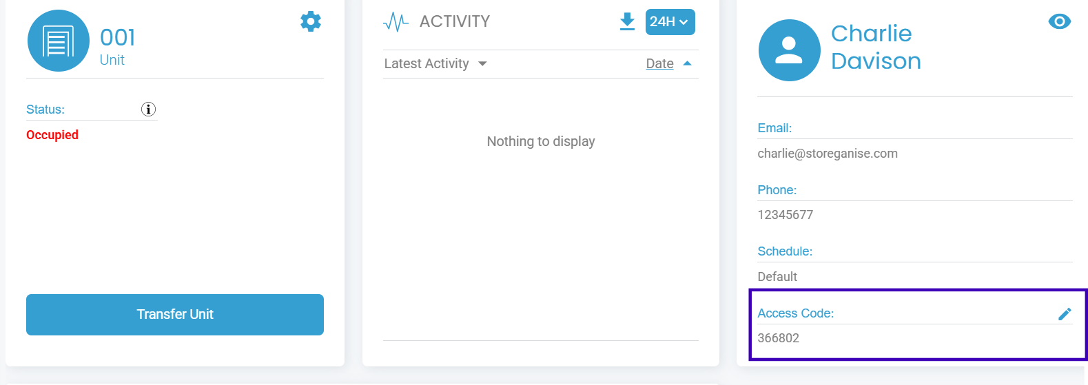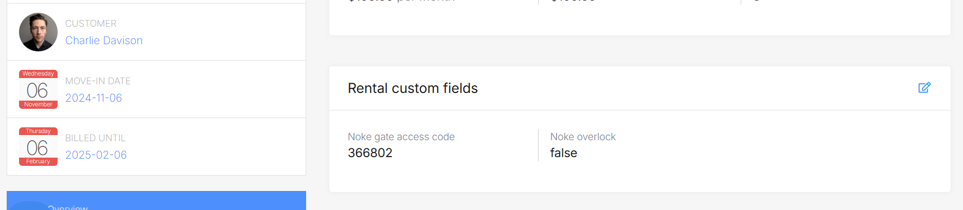 When a customer moves into a unit, the Gate Access Code is automatically generated and assigned to the customer in the unit rental details. This code is synced with Nokē, allowing the customer to access the assigned unit via the Nokē lock system.Viewing Access Codes:You can view the assigned Gate Access Code under the unit rental details in Storeganise.
