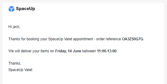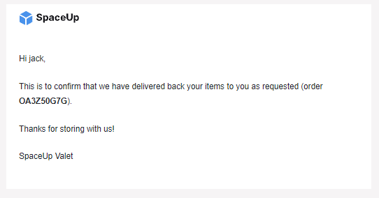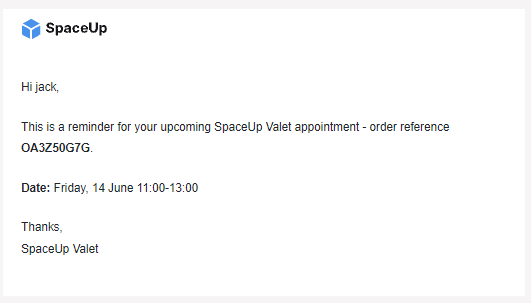 These are sample emails, customized for each Storeganise instance, including wording and branding, and may differ from your setup. Content will vary based on order details.Valet order confirmation email
