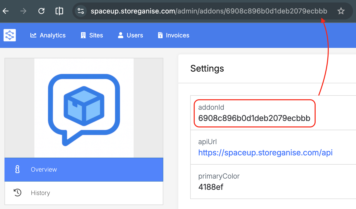 addonId: Found in the URL of the Add-on
