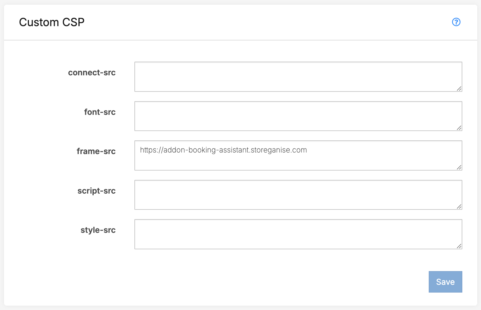 Go to Main Settings > Developer > Custom CSP and add the following line to the frame-src area:https://addon-booking-assistant.storeganise.com