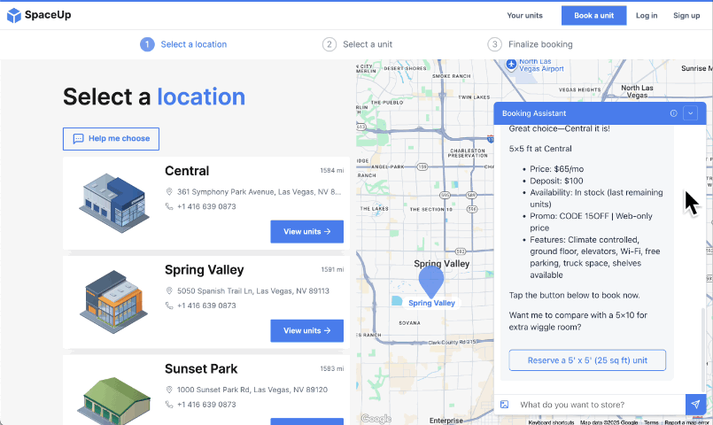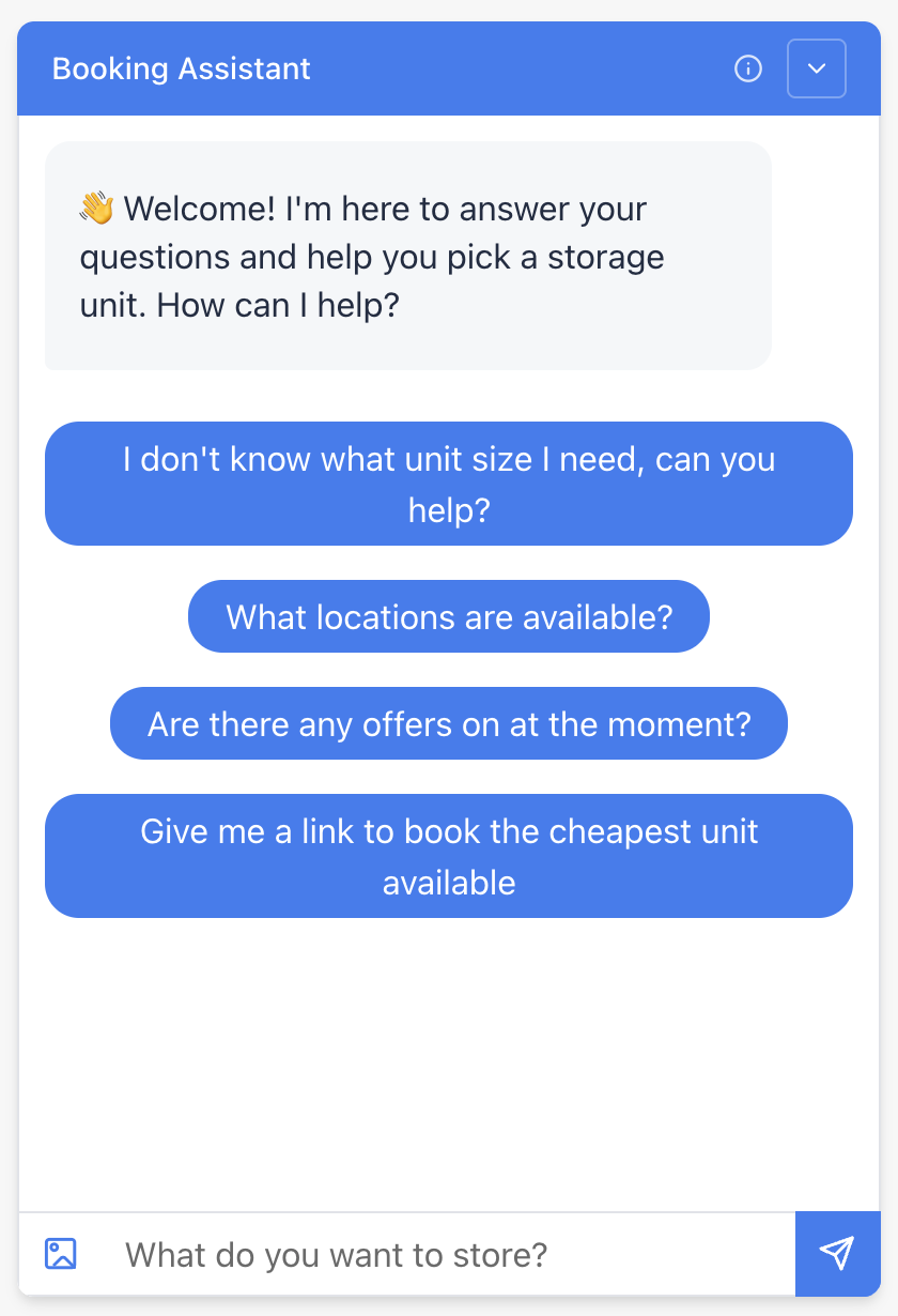 AI-guided bookings – The Assistant walks users through choosing a location, selecting a unit size, and identifying any promotions, simplifying the booking journey.