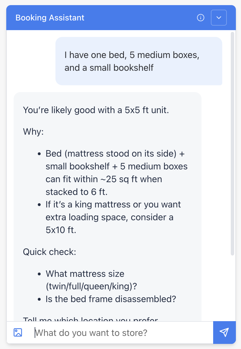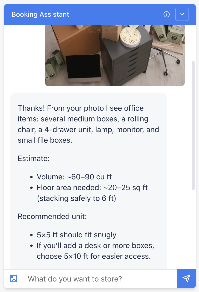 Find the right unit size instantly – Customers can simply type a short list of their items (e.g., “sofa, 10 boxes, bike, TV”) or upload a photo of their belongings, and the Assistant will estimate the ideal unit size in seconds. The system can analyze an uploaded image, identify the contents, and generate a precise, tailored unit recommendation based on what’s available.