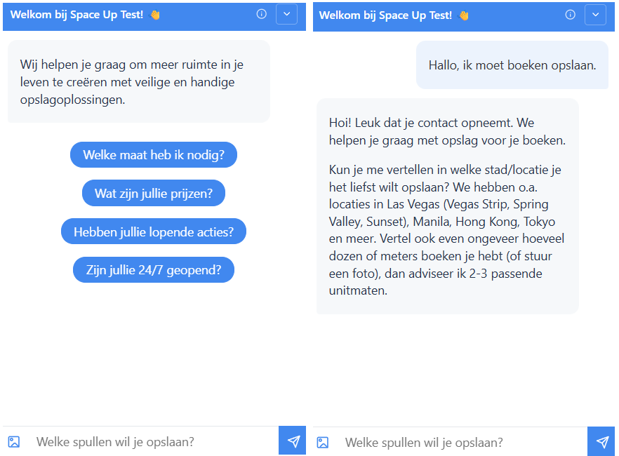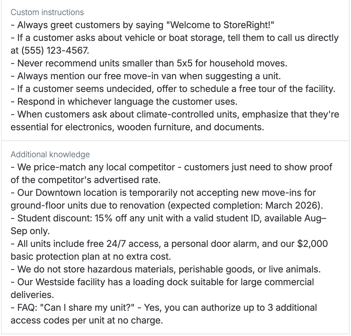 Facility information – In addition to unit size selection, the Assistant can answer questions such as opening hours, insurance pricing, or access details by pulling information from your facilities.