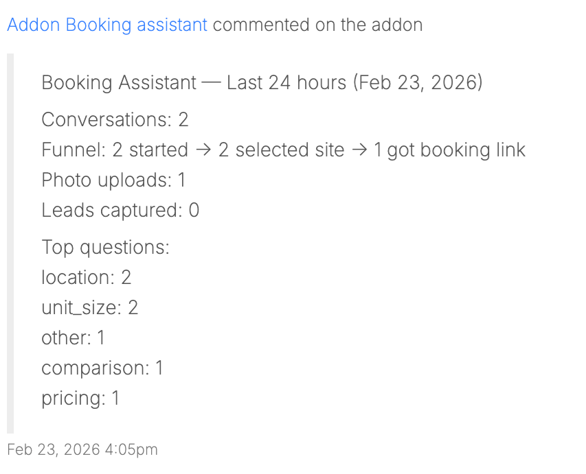 Operator context – Operators can add additional business context directly in the Add-on settings so the assistant can provide more accurate responses about facility policies, services, and promotions.