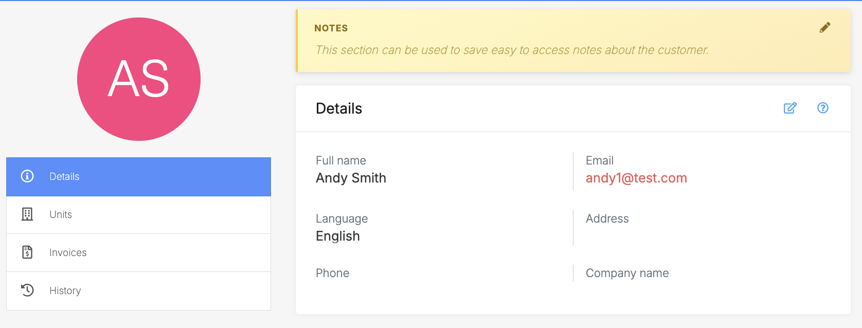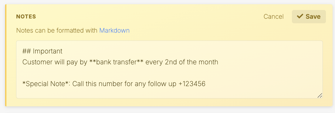 To add or edit Notes, open the customer profile or unit rental page. Locate the Notes section at the top of the page and click the pencil icon to begin editing.Enter your note and save your changes. The updated Note will remain visible at the top of the profile or rental.The notes section supports Markdown which enables you to add simple formatting to the text such as bold text, bullet points, and links. If you want to learn more about using Markdown, check out this Markdown cheat sheet or this Markdown editor.