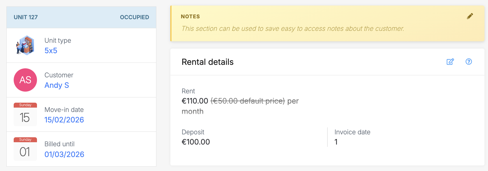 Storeganise allows you to add internal Notes to both customer profiles and unit rentals. Notes help you store important internal information that should remain visible and easy to access.