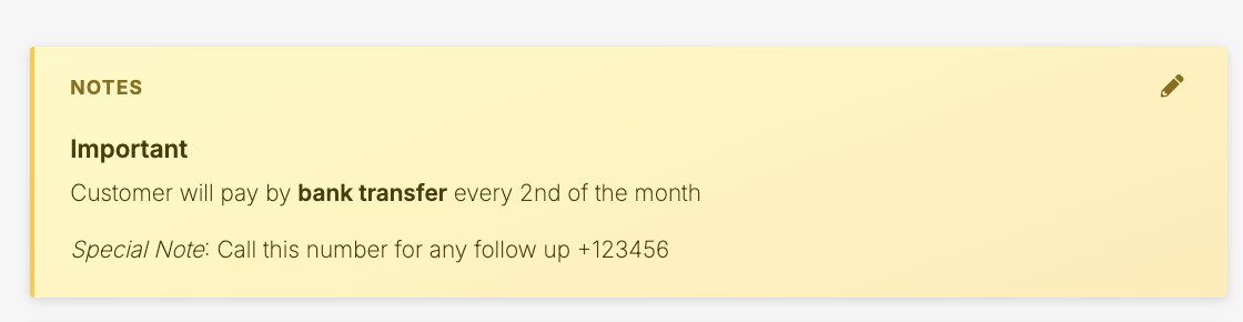 Use Notes to store important internal information that should remain visible and relevant over time.Examples include:- Customer preferences, such as “Prefers phone over email”
