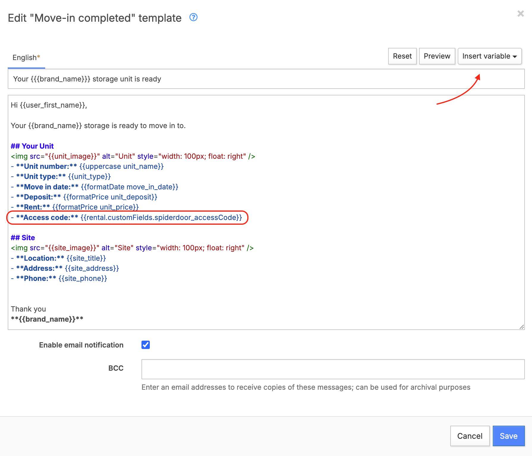 If your facility uses an access control system, Storeganise can automatically include the customer's gate or door codes in the move-in email. This means customers receive everything they need to access the facility in a single email, without you having to send codes manually.To include access codes in the email, you'll need to add them to your move-in email template. Regardless of which access control system you use, the user's access code is housed in a unit rental custom field. So to deliver this code to your customers you will need to add the corresponding custom field variable to the Move-in completed email template.This is easy to setup: