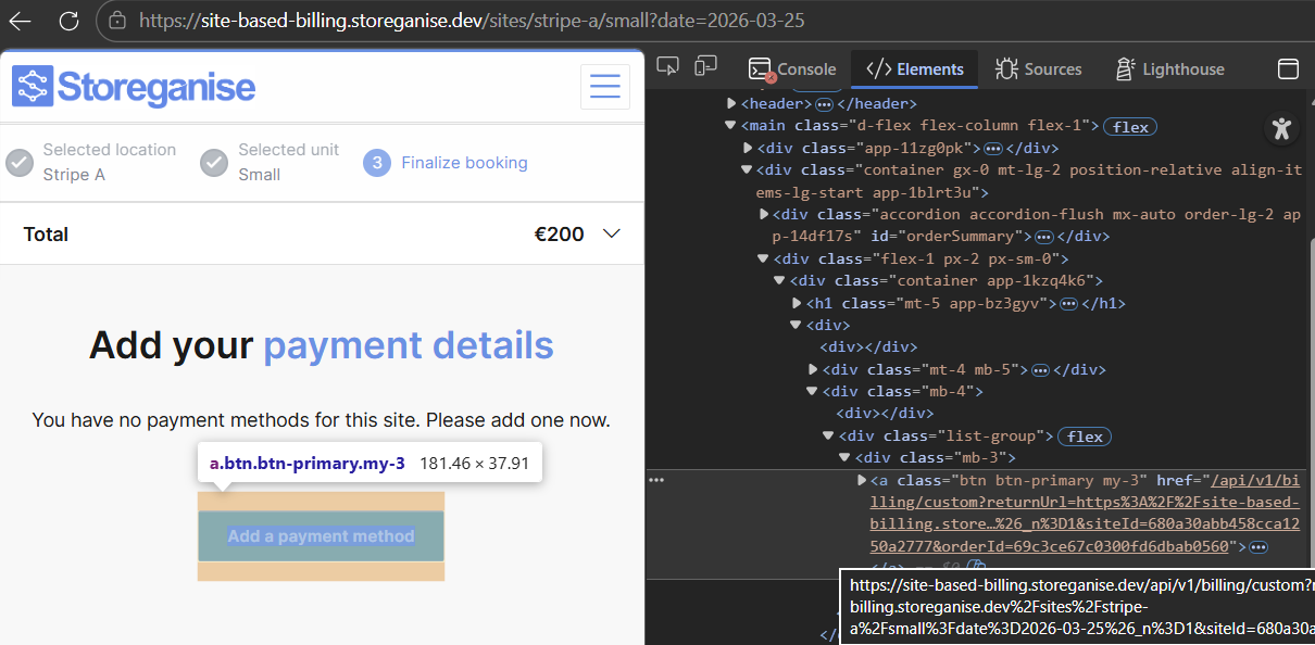 To let a customer add a payment method, redirect them to the custom billing checkout URL. Storeganise renders the payment provider's hosted UI, captures and tokenises the payment details, then redirects the customer back to your app.Render a link or redirect programmatically to: