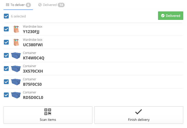 Alternatively, you can select the respective items by clicking on the ▢ icon next to each item (or the ▢ icon at the top of the list to select all).Once the respective items have been selected, click on the green Delivered button to mark the items as delivered and then you can complete the step.