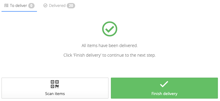 Note: On Android devices, use the Google Chrome browser. On Apple devices, you must use Safari in order for the camera barcode scanner to work.Click on the Finish delivery button to complete the step.