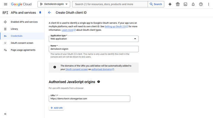 - Add your "Authorized JavaScript origins". This is typically the base URL of your customer portal (e.g. https://yourcustomerportal.storeganise.com). If you have a custom domain (e.g. https://www.yoursite.com) you will also need to add this to the list.
